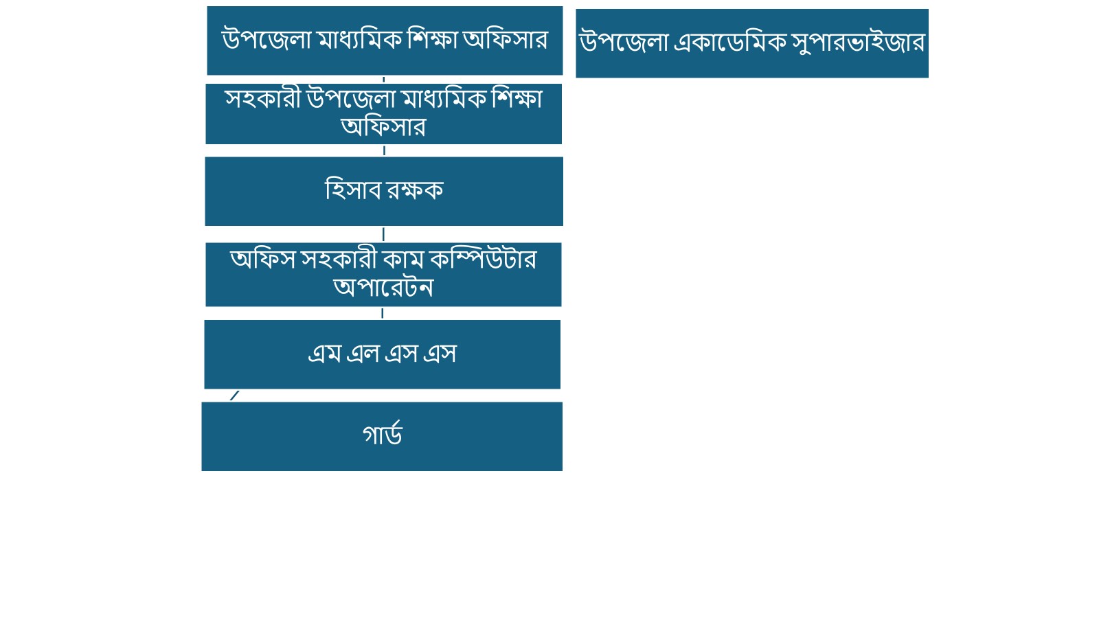 উপজেলা মাধ্যমিক শিক্ষা কর্মকর্তার অধীনে ১জন উপজেলা একাডেমিক সুপারভাইজার, ১জন সহকারী উপজেলা মাধ্যমিক শিক্ষা কর্মকর্তা, ১ জন হিসাব রক্ষক, ১জন অফিস সহকারী কাম কম্পিউটার অপারেটর, ১জন এম এল এস এস এবং ১জন গার্ড।