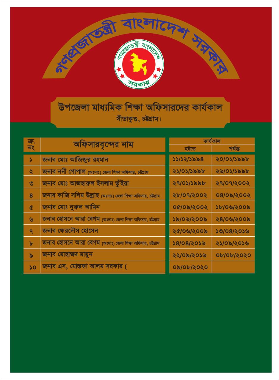 উপজেলা মাধ্যমিক শিক্ষা অফিস, সীতাকুণ্ড, চট্টগ্রামে পূর্বে কর্মরত অফিস প্রধানবৃন্দের নামের তালিকা নিম্নে সংযুক্ত করা হয়েছে।